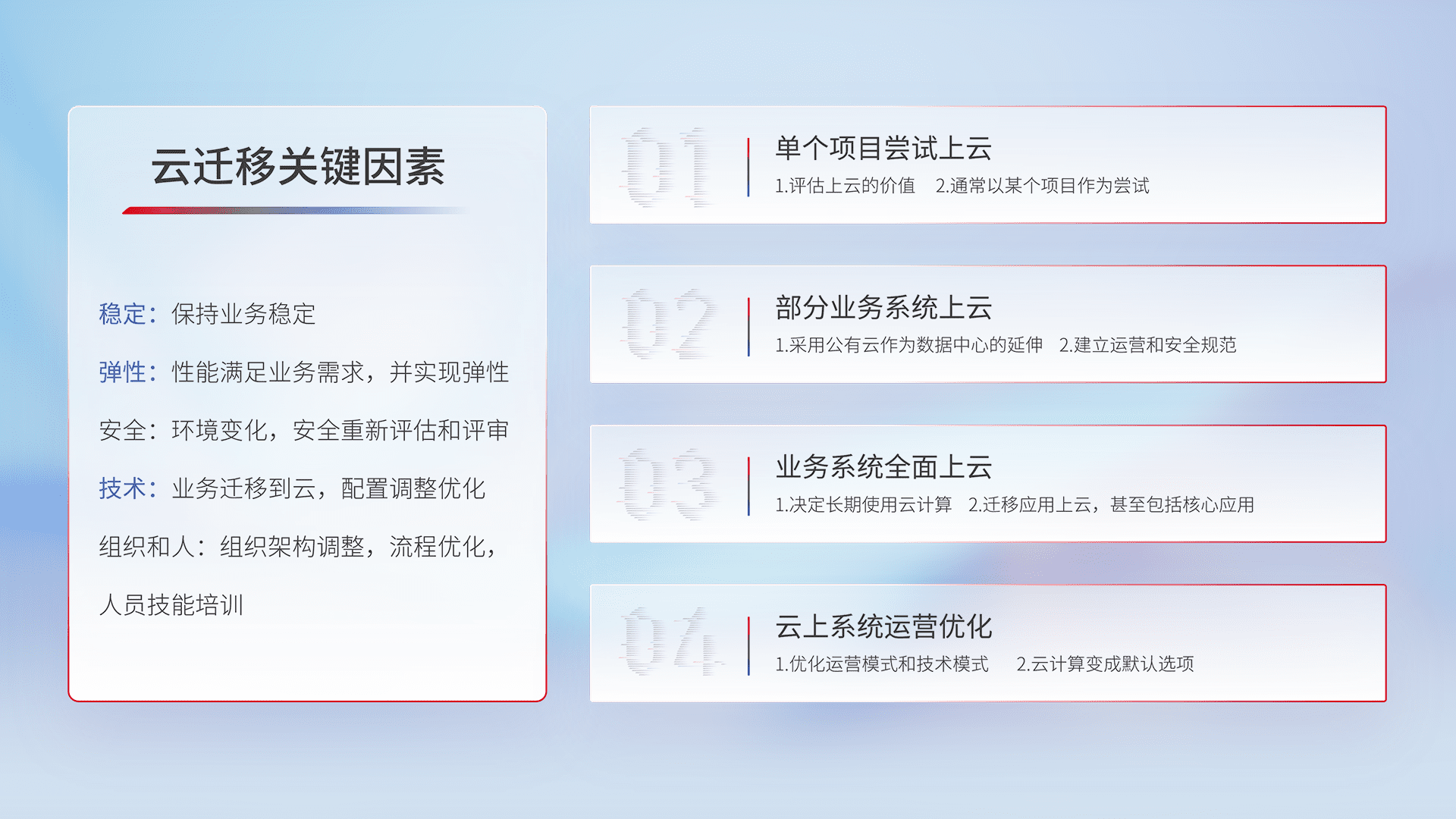 结合实际业务,,,,从规划设计、、、云平台选型、、、、云原生改造、、数据迁移、、、、集成交付,,,迁移全过程为客户识别最佳上云路径,,做好风险识别管理,,,,设计网络架构、、身份权限、、、、安全审计合规、、操作审计、、、日志审计、、、监控告警策略、、、多站点容灾设计等,,,对云上基础设施进行整体规划,,提升IT治理水平,,,,以满足弹性、、、、高可用、、、、高性能的需求。。